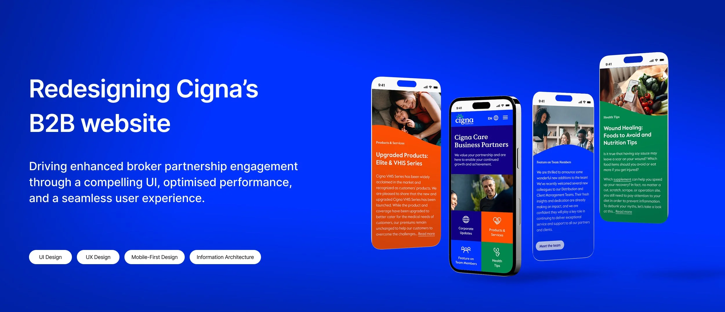 2021 Live Project: My foundational work on the Cigna B2B website redesign, specifically aimed at significantly enhancing partner relationship for 1,000+ insurance brokers.