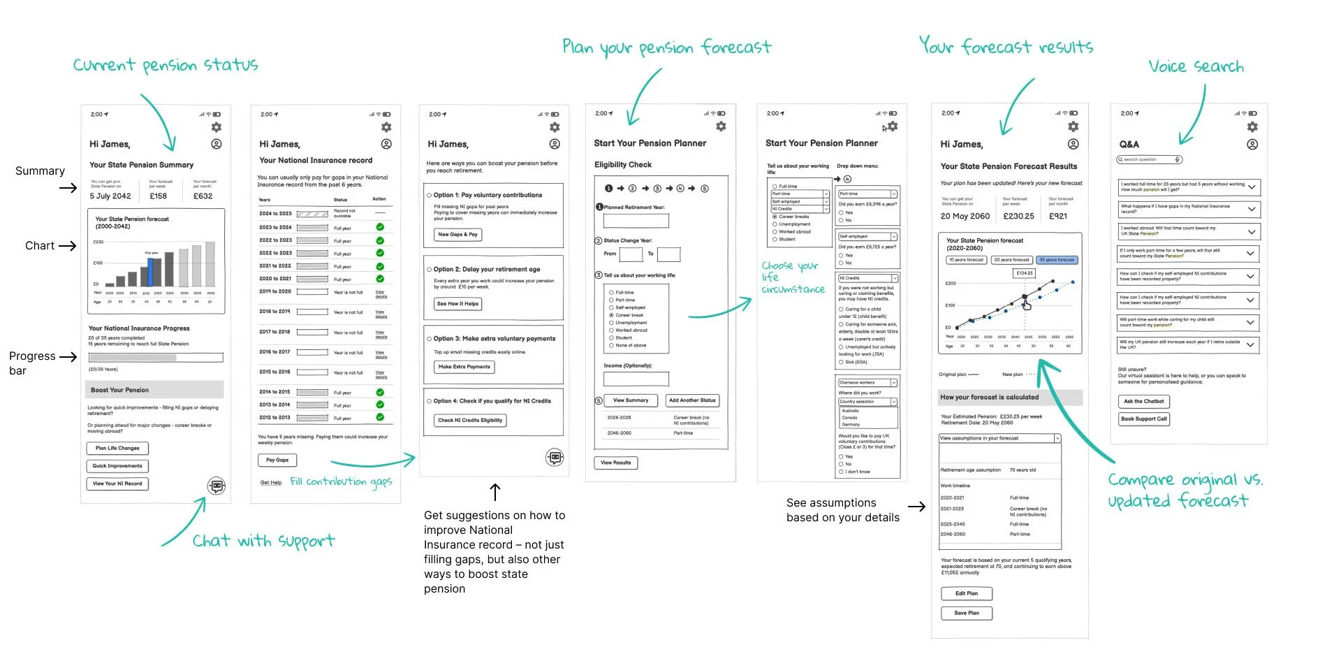The final screens focused on pension overview dashboard, NI contribution record, personalised improvement options, a step-by-step forecasting tool, final results with visual projections.