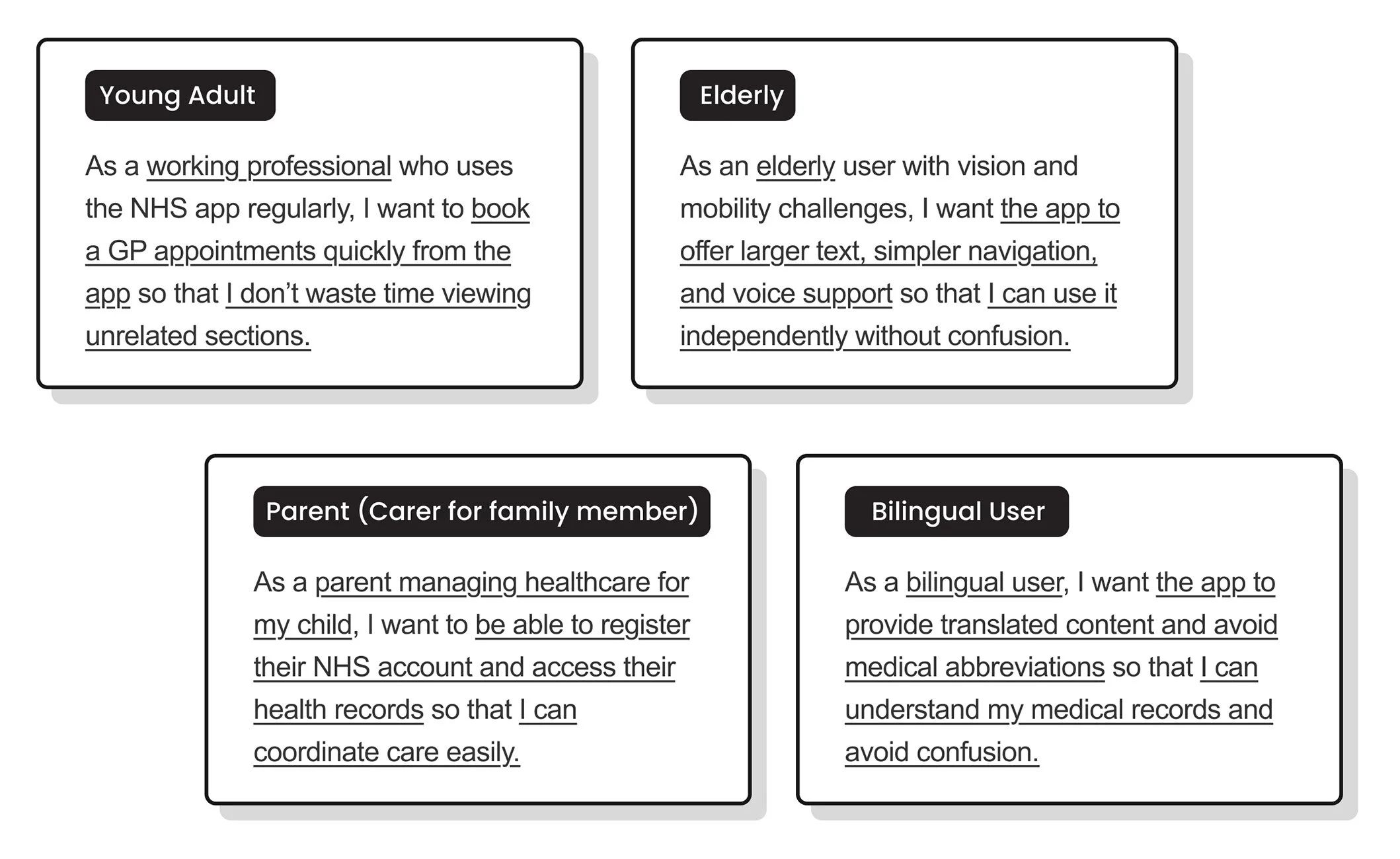 To ensure our design decisions resonate with real people, I develop user stories. These narratives are built on authentic insights, capturing the unique goals, frustrations, and needs of diverse user segments.