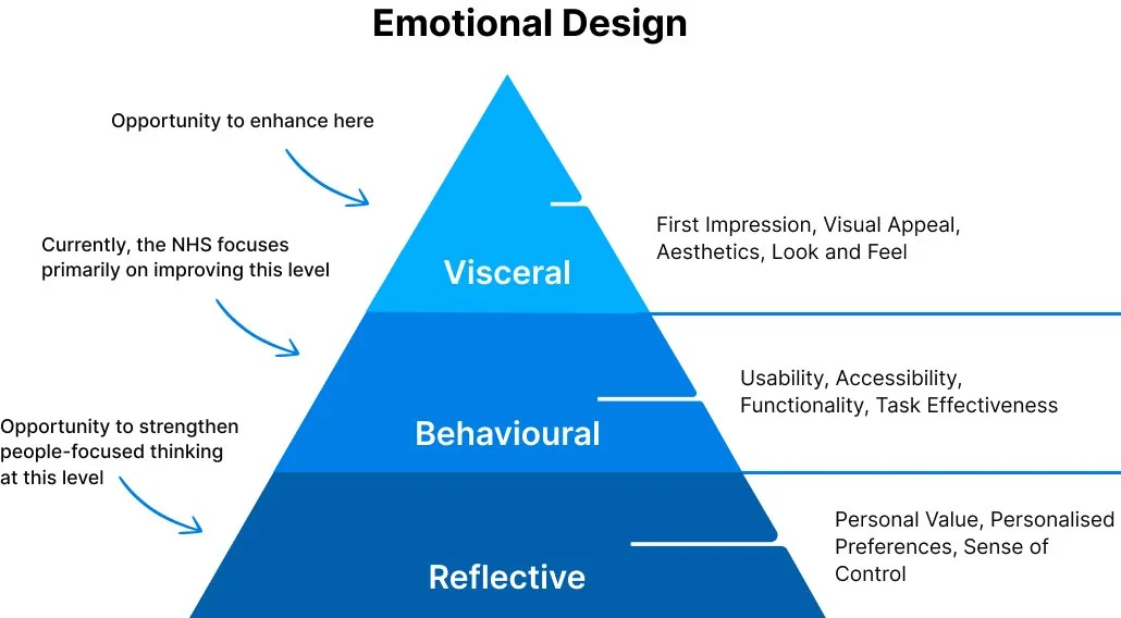To elevate patient engagement within the NHS app, I integrated a 3 level emotional design framework into a comprehensive User-Centered Design (UCD) process: Research, Ideation, Prototyping, and Evaluation. This approach allowed for a holistic understanding of user needs, from foundational functionality to intuitive interaction and personalised experiences.