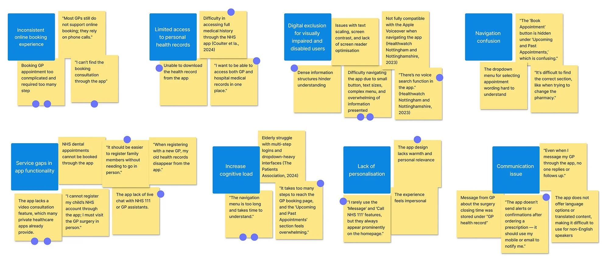 To synthesise complex user data, I utilised Affinity Mapping to visually cluster fragmented insights. This process helped identify 8 core themes (blue stickers). and prioritise the most critical usability and accessibility issues through dot voting, focusing efforts on challenges deemed most urgent to resolve.